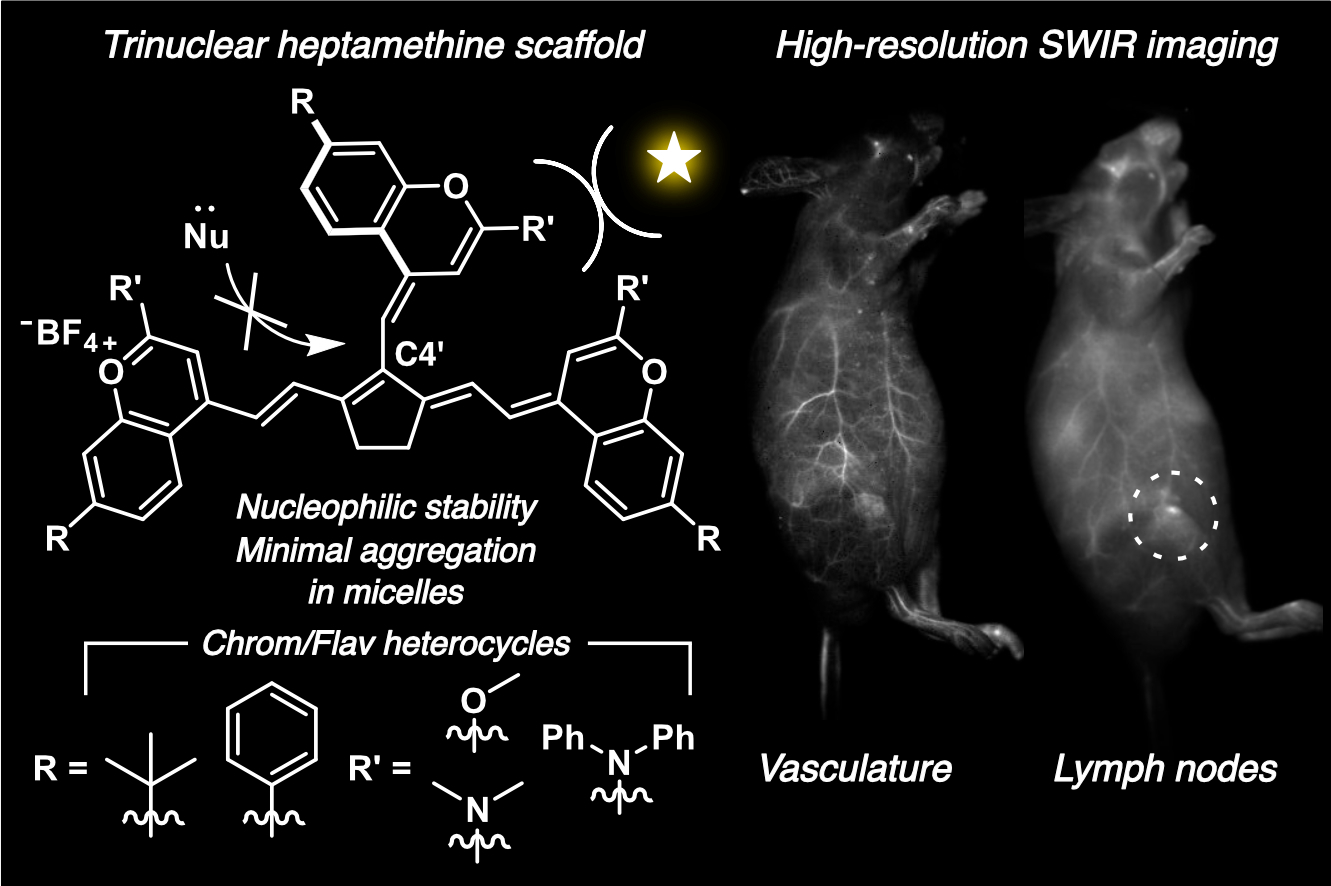 The term polymethine dye (PMD) has been intimately connected to the dinuclear scaffold–two heterocycles linked together by a polymethine chain of varying length. Dinuclear PMDs have been a successful scaffold for noninvasive in vivo imaging in the biologically advantageous near infrared (NIR) and shortwave infrared (SWIR) regions of the electromagnetic spectrum. Trinuclear PMDs, resulting from the addition of a third heterocycle into the polymethine chain, possess the same photophysical properties that make dinuclear dyes excellent fluorescent probes, but have yet to be investigated for in vivo imaging. Herein, we expand upon the dinuclear and trinuclear heptamethine dye scaffolds by taking advantage of the increased reactivity of a cyclopentenyl linker and synthesizing flavylium- and chromenylium-based SWIR-emitting fluorophores. The trinuclear scaffold instills the fluorophores with increased steric bulk, leading to beneficial photophysical properties in micelles and outperforming their classic dinuclear counterparts. In this work, we apply trinuclear PMDs for in vivo SWIR imaging in mice and find them to be particularly efficient at lymph node labeling upon intravenous administration.