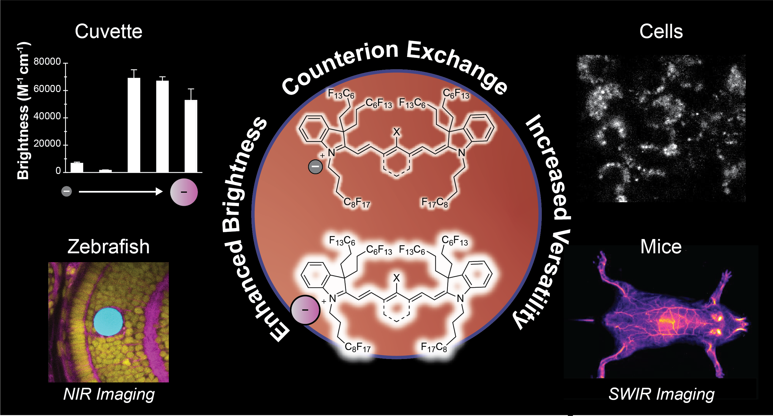 Fluorescence imaging across the near-infrared (NIR, 700–1000 nm) and shortwave infrared (SWIR, 1000–2000 nm) regions offers significant advantages for biomedical applications. Over the past decade, we have advanced a unique class of fluorophores–deemed fluorofluorophores–that are soluble in the fluorous phase. The unique properties of the fluorous phase, including low polarizability and high oxygen content, render this medium challenging for fluorophore brightness and photostability. However, the low dielectric constant of perfluorocarbon solvents causes the counterion to play a significant role in the resulting photophysical properties, offering a nontraditional avenue for fluorophore optimization. Here, we demonstrate that counterion exchange provides a straightforward strategy to enhance the brightness of two fluorous-soluble heptamethine cyanine dyes for NIR and SWIR imaging. Exchanging a chloride counterion with bulkier fluorinated aryl borate counterions boosts the brightness up to 10-fold and photostability up to 60-fold in perfluorooctyl bromide. We showcase the utility of these bright, NIR fluorofluorophores for imaging perfluorocarbon nanoemulsion uptake in macrophage cells, visualizing droplet actuation for mechanobiology studies in zebrafish, and mapping vasculature using high-resolution SWIR detection in mice. Overall, this simple modification provides a practical approach to optimize fluorofluorophores for in vivo imaging without the need to redesign the entire fluorophore scaffold.